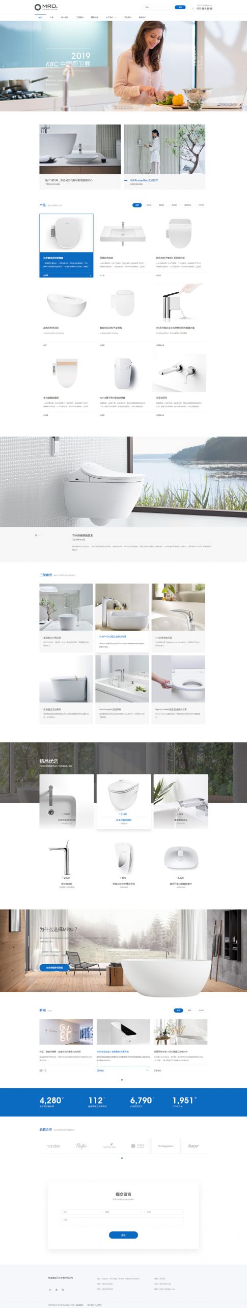 我们来看看UEmo魔艺极速建站mo005_15375模板。这套模板是专门为自动化卫浴类品牌而打造的。自动化卫浴产品有哪些特点呢?清洁感、品质感、科技感……要变先出这些特点,不是件容易的事,不过UEmo魔艺极速建站优秀的设计师们,运用配色、板块设计、动效设计等方式体现了上述的特点。